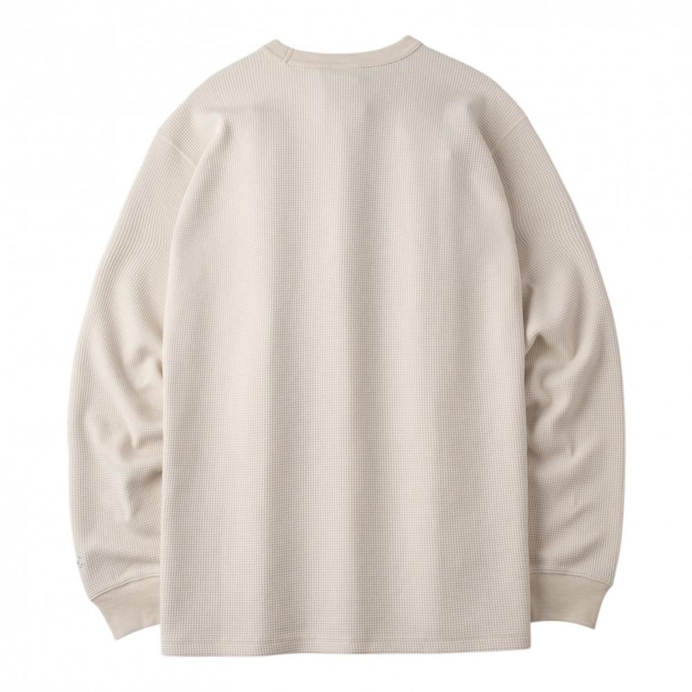 高い保温性を誇るワッフル編みの表面と、肌触りの良いフラットな裏面を組み合わせた生地を採用。この独自の構造により、保温性と快適性を両立した着心地の良い一着に仕上げています。